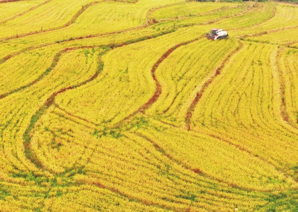 10月26日,衡东县杨林镇,村民驾驶农机收割再生稻。金秋时节,该镇的再生稻进入收割季,村民抢抓晴好天气收割、晾晒再生稻。