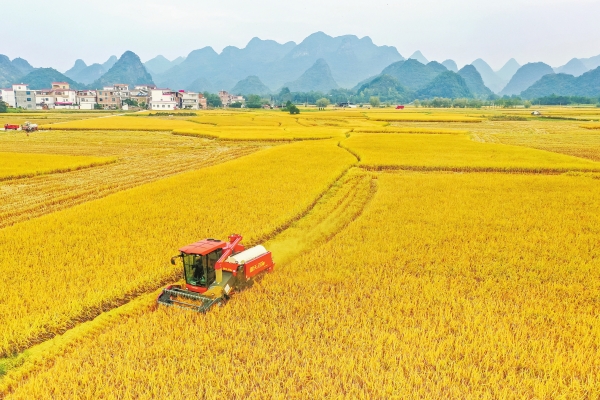 10月26日,宁远县湾井镇下灌村,收割机在稻田里来回穿梭作业。金秋时节,该县19.3万亩晚稻进入集中收获期,当地通过“科技+服务”模式,助力秋粮丰产丰收。