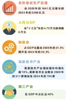 益阳市地区生产总值由2020年的1841亿元增长到2024年的2268亿元。今年前三季度,实现6%的增长,增速居全省第4位。人均GDP由“十三五”末的4.75万元到突破6万元。制造业占GDP比重由2020年的31.5%提升至2024年的33.3%,位居全省第3位。第三产业在GDP中占比达40%。
