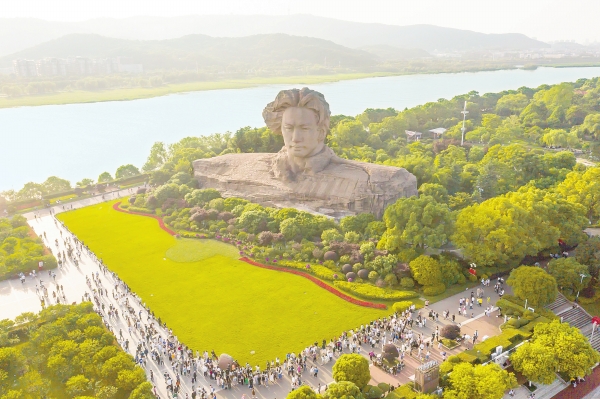是呵,望着“秋风萧瑟,换了人间”“万类霜天竞自由”的无限秋色,感触着“长岛人歌动地诗”的时代脉搏,谁都会想起100年前,毛泽东在橘子洲写下的豪迈雄伟诗篇。此刻,我真切地听到浩荡的湘江,正扬波高声吟诵毛泽东的《沁园春·长沙》: