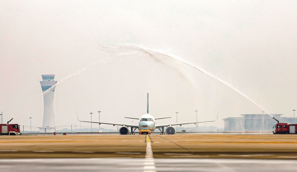 11月4日,国泰航空CX968航班从香港起飞,顺利落地长沙黄花国际机场,标志着国泰航空香港往返长沙航线正式通航,为湖南及华中地区与粤港澳大湾区架起高效便捷的“空中桥梁”。图为机场以民航最高礼遇“过水门”仪式迎接首航航班。