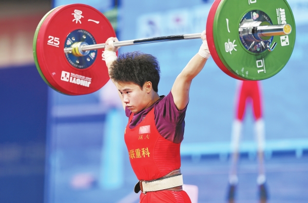 11月10日晚,在东莞举行的第十五届全运会举重女子49公斤级决赛中,奥运会“双冠王”侯志慧以抓举93公斤、挺举110公斤、总成绩203公斤的成绩夺冠,为体育湘军拿下开幕后首块金牌。这枚来之不易的金牌,也让侯志慧在28岁的年龄成就了全运会三连冠。湖南日报全媒体记者 傅聪 摄