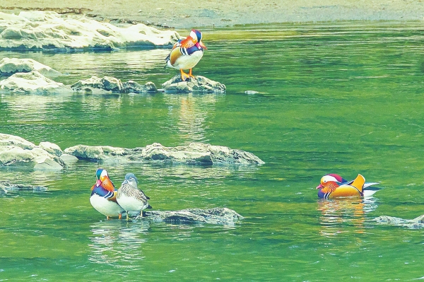 11月12日,平江县浯口镇,一群鸳鸯在汨罗江嬉戏、觅食。近年来,随着当地生态环境持续改善,飞抵汨罗江越冬栖息的鸳鸯逐年增多。