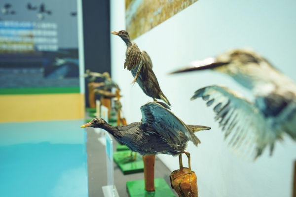 踏入馆内,铺地的蓝色砖呼应着浩渺的湖水,鸟类的标本展现眼前。