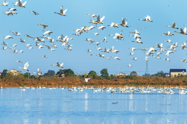 11月25日,成群的小天鹅在飞翔、嬉戏、觅食。入冬以来,随着气温逐渐下降,约3000只西伯利亚小天鹅已飞抵位于岳阳市屈原管理区的东古湖湿地。近年来,随着湿地修复工程见效,越来越多的候鸟选择在此栖息越冬。