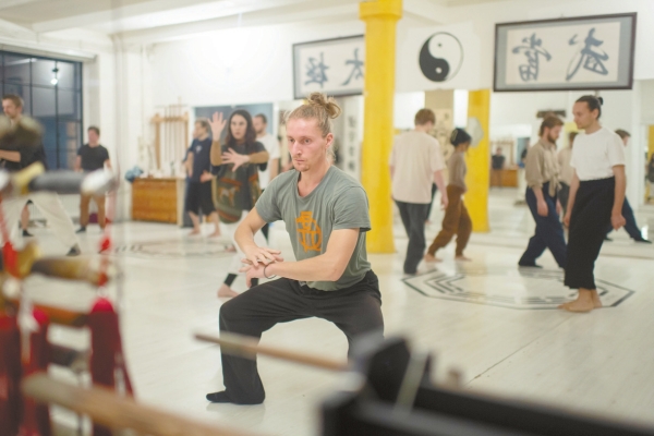 11月13日,德国学员在柏林“玄”武术馆练习武术(镜像)。