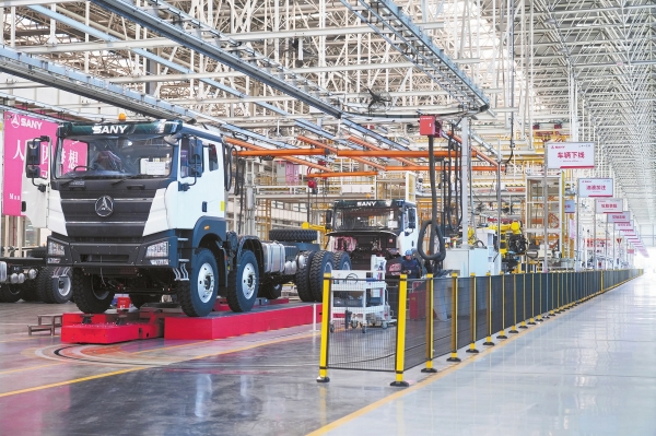 在三一专汽总装车间,机械臂如银色长臂精准挥舞,AGV无人车驮着零部件穿梭于生产线,一台台崭新的电动搅拌车沿着轨道缓缓下线……
