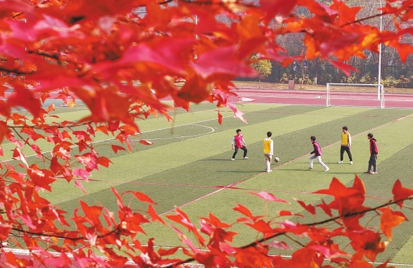 12月8日,学生在南华大学运动场上进行足球训练。沐浴着冬日暖阳,该校学生纷纷走出教室参与体育锻炼,校园里处处跃动着朝气蓬勃的身影。