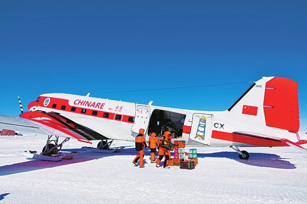 图为12月8日,“雪鹰601”飞抵格罗夫山区域,为内陆队员运输生活物资与科研设备。