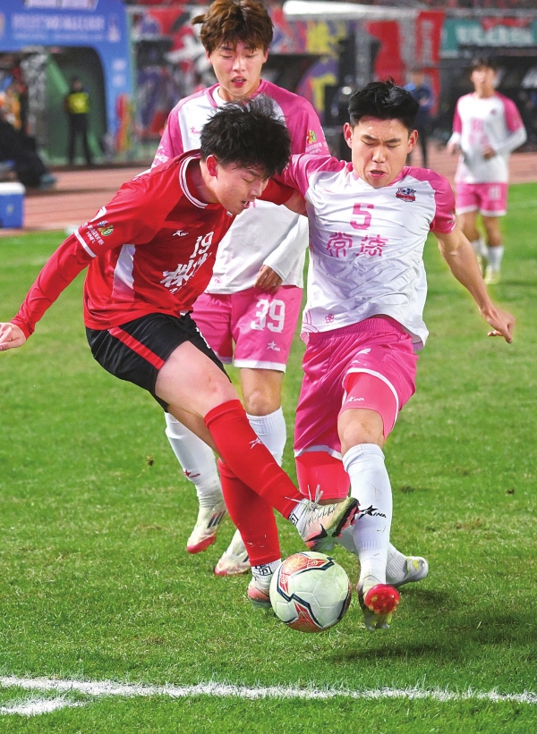 两队常规赛交手,株洲曾以1球小胜,当时唯一的一粒进球,缘自常德门将王峰琦的一次开大脚失误。如今半决赛再碰面,38岁的老将王峰琦明显打起了十二分精神,全场高接低挡,数次化解门前险情。而实力相当的两支劲旅也再一次陷入缠斗,比赛中双方中场拼抢激烈,互有攻防,但比分始终维持在0比0。