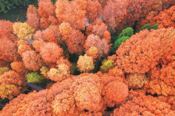 “哇!”惊叹在山间此起彼伏。千亩水杉林像火狐尾巴一样倒竖,金红灿烂,撩拨人心。