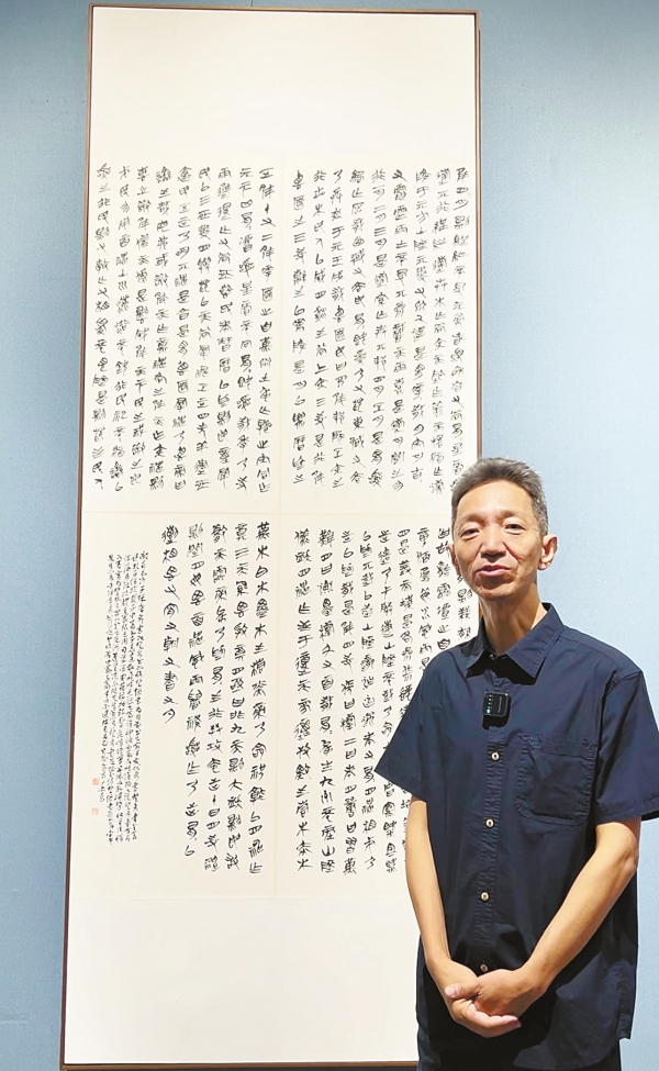 此次展览中,他带来了一临一创的作品:“今年是研究展,要求一临一创。我写的是楚简,临的是郭店楚简,创作的是一件风格相近的楚简作品。”