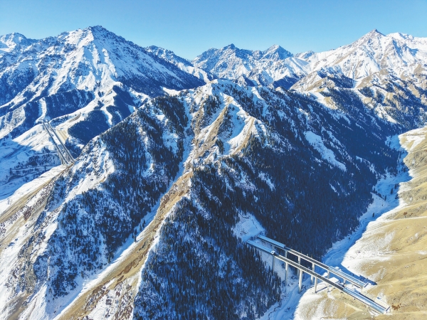 全长22.13公里的世界最长高速公路隧道——天山胜利隧道及其所在的G0711新疆乌鲁木齐至尉犁高速公路(简称“乌尉高速”)即将实现全线通车。届时,天山以北的乌鲁木齐至天山以南的库尔勒的通行时间将从7小时缩短至3小时左右。图为桥隧相连的乌尉高速穿越天山山脉(12月23日摄,无人机照片)。