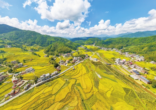 桂东县沤江镇,中铁四局援建的中铁振兴大道X006线公路与稻田、村庄和青山构成一幅美丽的田园画卷。湖南日报全媒体记者 郭立亮 摄