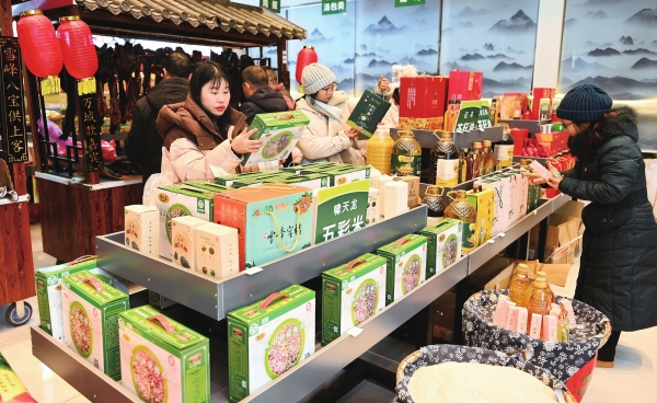 1月3日,洞口县文昌街道桔城味道特产商场,市民在选购商品。针对近期寒冷天气,该县全力保障物资供应,市场货品充足,价格稳定。