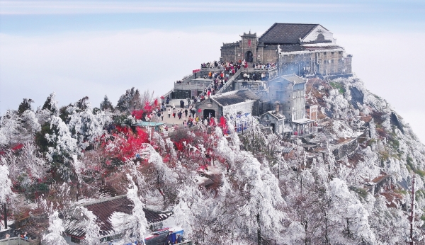 1月3日,南岳衡山风景区雪后初霁。晶莹雾凇凝结枝头,翻腾云海漫卷群峰,吸引众多游客前来观赏。