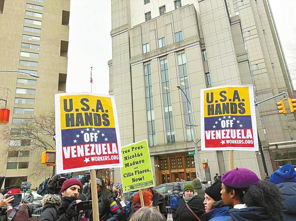 美国东部时间1月5日,遭美国强行控制的委内瑞拉总统马杜罗被带至纽约南区联邦地区法院,人们在法院外抗议美国对委内瑞拉发动军事打击(手机照片)。