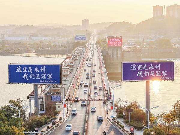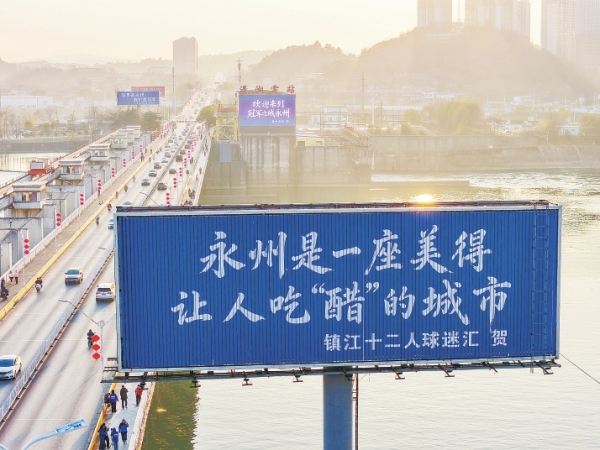 1月7日,永州市冷水滩区宋家洲大桥桥头,多个统一成蓝底白字样式的大型户外广告,成为一道亮丽的风景线。广告词分别有“这里是永州,我们是冠军”“这里是永州,冠军专属‘州’”……落款是远在千公里之外的江苏南京、苏州、泰州、南通等地的网友和球迷,引发众人关注。