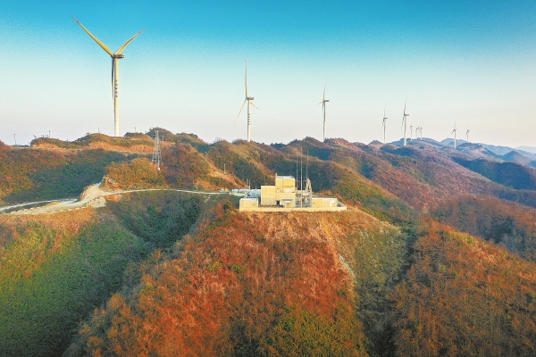 1月9日,龙山县大灵山风力发电场,风力发电机迎风运转。近年来,该县立足高海拔区位优势,大力开发风能资源,实现生态效益与经济效益双赢。