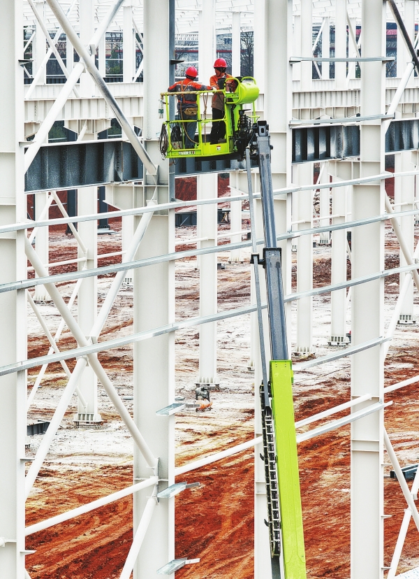 1月19日,嘉禾高新区湖南金松汽车有限公司二期项目现场,工人在进行钢结构搭建作业。连日来,该高新区内各重点项目加紧施工,力争实现早建成、早投产。