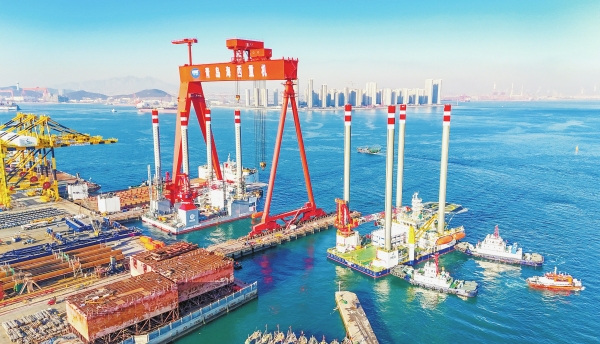 1月22日,由中船武汉船机海西重机自主设计建造的两座新一代“海上移动岛”——TYPE3 PRO型自升式海上作业支持平台,从青岛西海岸新区启航,发往中东波斯湾海域交付(无人机照片)。该型平台集作业高效、绿色环保与网络安全等先进性能于一身。