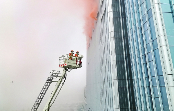 1月28日,岳阳市举行高层建筑灭火救援综合演练。当地消防、公安、医疗、水务、电力等多部门联动参与,检验火灾应急响应联动机制和高层建筑灭火救援能力,进一步提升有效应对各类灾害事故的处置水平。图为演练现场。