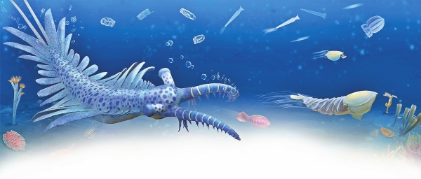 长达2米的奇虾,是地球上最早的巨型动物和顶级捕食者。花垣生物群发现了多样的奇虾类动物。它们的存在表明,这片海域存在一个具有复杂捕食关系的食物网。