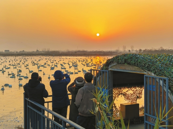 截至2026年1月,东古湖小天鹅数量突破1万羽,白鹤、灰鹤、雁鸭、鹬鸟等珍稀候鸟总数超6万羽。