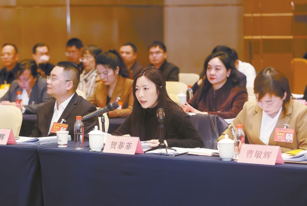2月6日,娄底市代表团贺菲菲代表围绕如何发挥网红群体在经济建设中的积极作用建言。