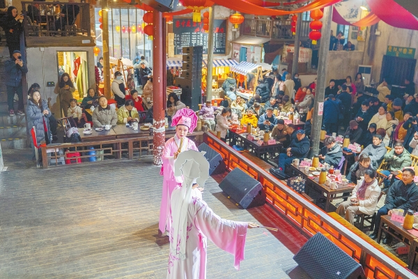 2月9日,长沙市东茅街茶馆,演员在表演节目《十八相送》。