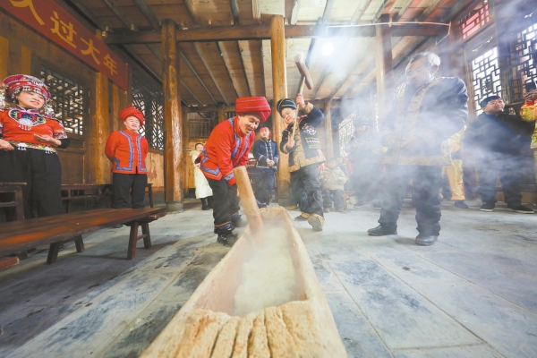 2月9日,龙山县召市镇神州社区马洛沟村,村民在打糍粑。