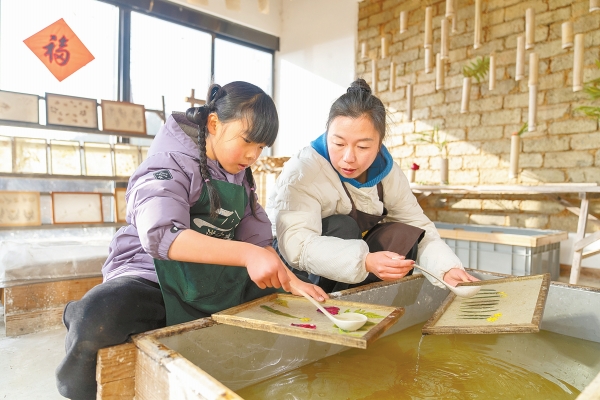 如今,道官冲的手工竹纸制作、送春牛、夯土墙制作等3项传统技艺和民俗均已成功申报为省级或市级非遗代表性项目,巫家拳、纸影戏影偶制作技艺等多项非遗代表性项目也在此集聚,构建出集展览互动、传习生产、研学体验、人才孵化、文创研发、市场推广于一体的非遗生态闭环,曾经的空心村成了名副其实的“非遗生态村”。