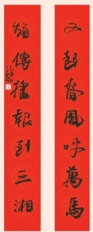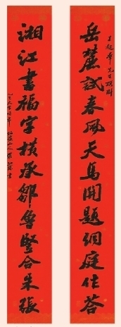 岳麓试春风,天马开题,洞庭作答; 湘江书福字,横承邹鲁,竖合朱张。 王超群 撰 罗红胜 书 |