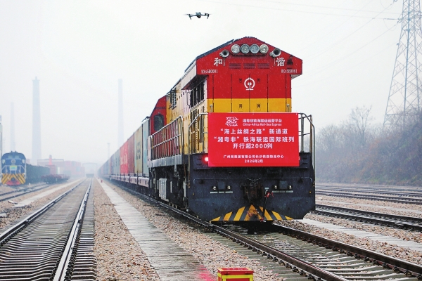 2月11日,一列满载汽车配件的“湘粤非”铁海联运国际班列从湖南长株潭口岸经贸发展有限公司专用铁路开出。这是自2021年“湘粤非”铁海联运国际班列开行以来的第2000趟班列。去年,“湘粤非”班列运输货物58299标箱,同比增长23.9%;货值增长达17.28%。