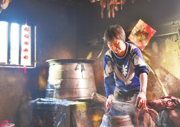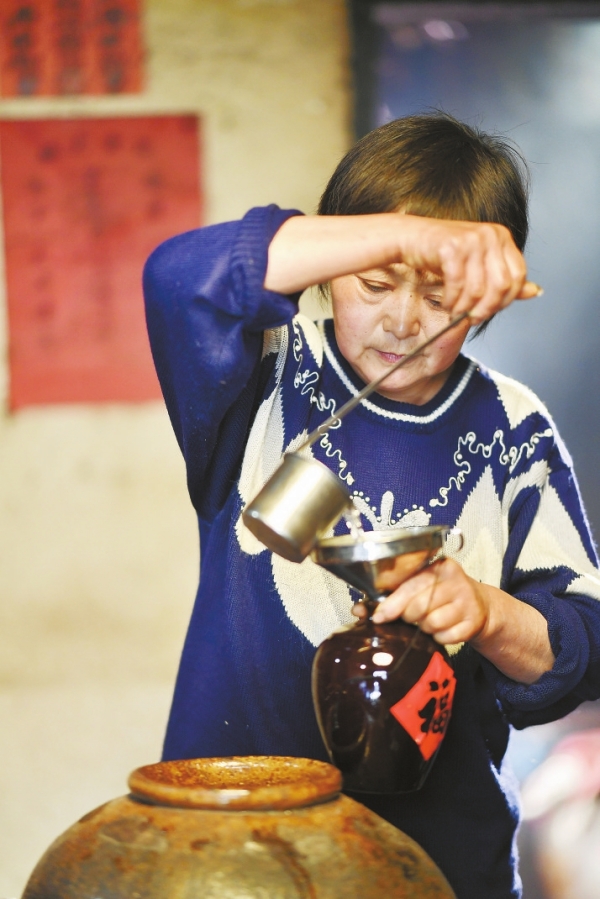 柴火灶上,古朴木甑冒着袅袅雾气,清亮的米酒顺着导管“滴答——滴答——”流入陶坛,像是在诉说古村的酿酒往事。