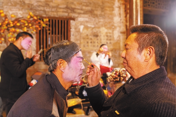 大院一角临时充作化妆间的厢房里,镜前人执笔凝神,一缕红、一抹金,在眉梢和眼角徐徐绽开,古戏中人的魂灵,便从斑斓色彩里脱胎而生。