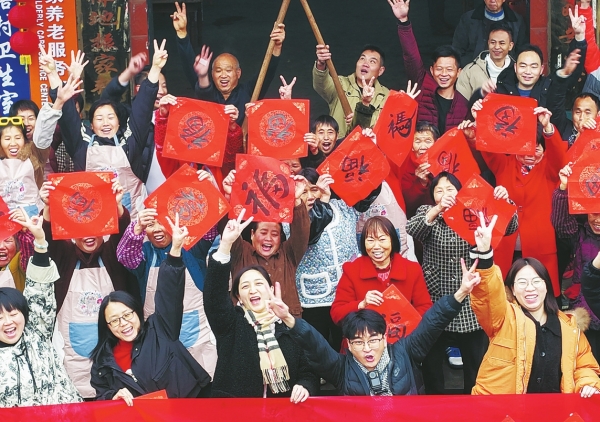2月17日,嘉禾县袁家镇乌塘村,村民在拍合照。当天是大年初一,该村村民聚在一起,做糍粑、吃油茶、拍合照,热热闹闹过春节。