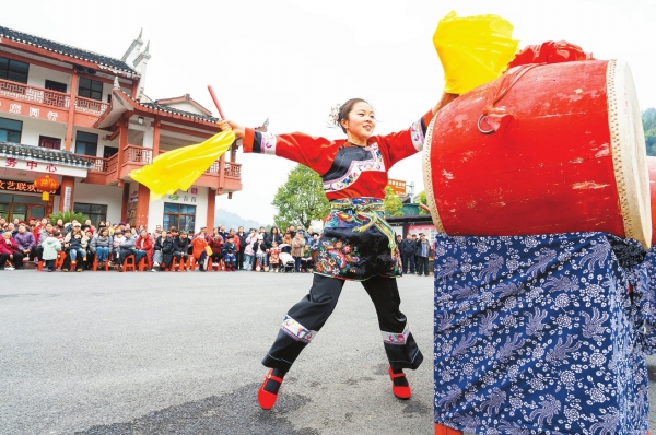 2月17日,吉首市石家冲街道寨阳村,村民打苗鼓欢庆新春。