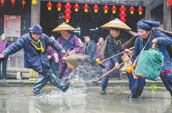 民俗专家粟远和站在游客中,笑着点破:“瞧,这演的,就是犁田水浑时,捕鱼捞虾的热闹。劳作的辛苦,都化成戏台上的欢喜了。”