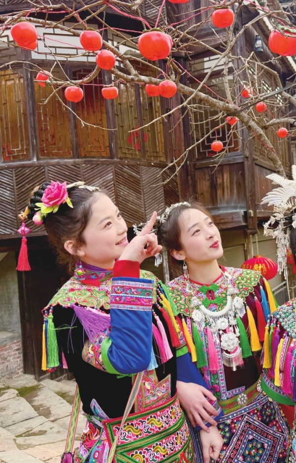 2月22日,通道侗族自治县皇都侗文化村,游客在打卡留影。