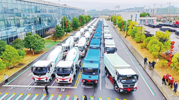 2月24日,188台混凝土搅拌车和工程自卸车从邵阳经开区三一专用汽车有限责任公司驶出,发往全国各地。这是三一专汽新春交付的首批订单新车,总价值约1.2亿元,实现“开门红”。
