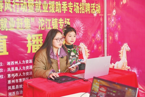 2月25日,凤凰县沱江镇,工作人员在直播带岗。当天,该县17个乡镇同步开展“春风行动”就业赶集专场招聘活动,共组织664家企业提供28711个岗位,涵盖湘沪浙粤闽苏等多地岗源,方便群众择业。