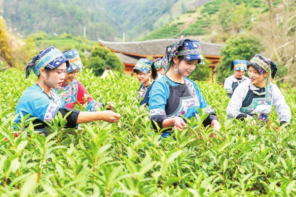 2026湖南·保靖黄金茶茶文化旅游季——春茶第一采暨纳福村集活动,3月3日在保靖县吕洞山镇黄金村启动,茶农们采摘首批鲜叶。
