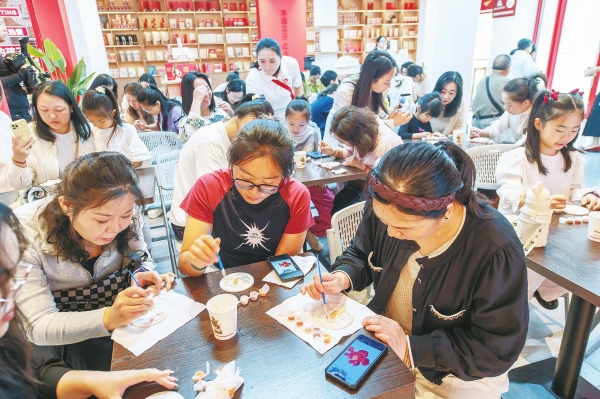 3月8日,位于海南省琼海市的红色娘子军纪念园举办“琼花传匠心 经典绘新篇”妇女节主题文化活动。图为游客在创作釉彩作品。