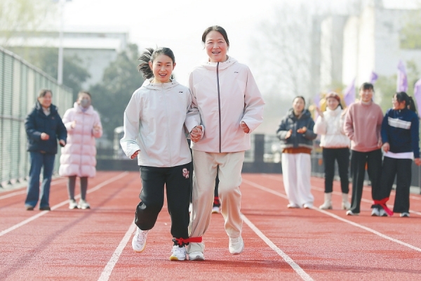 3月8日,在河南省焦作市温县全民健身活动中心,女职工参加“两人三足跑”趣味比赛。