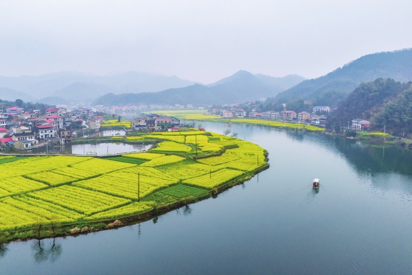 3月9日,双峰县梓门桥镇街埠头村,游船行驶在测水河上。正是春日好时节,当地油菜花绽放,与碧绿的河水构成一幅秀美的水乡画卷。