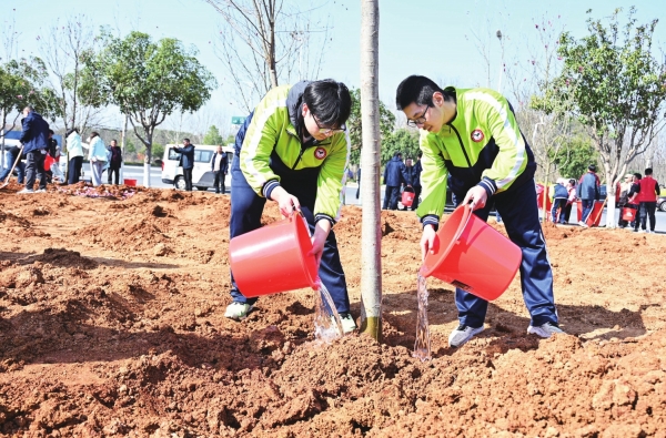 3月11日,澧县澧澹街道白羊湖社区,澧县二中学生在植树。