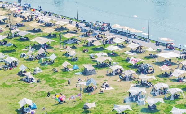 3月14日,长沙市开福区湘江风光带,人们搭帐篷、铺餐垫,尽情享受和煦春光。湖南日报全媒体记者 李健 摄