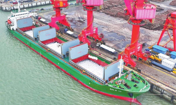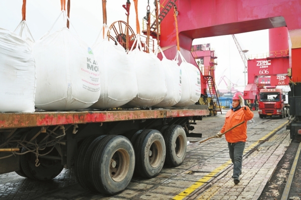 连日来,江苏张家港锦隆重件码头一片繁忙,及时卸运国际航行船舶装载的进口化肥,助力春耕生产。