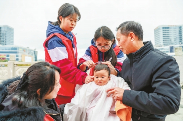 3月20日,吉首市世纪广场,志愿者在为小朋友理发。
